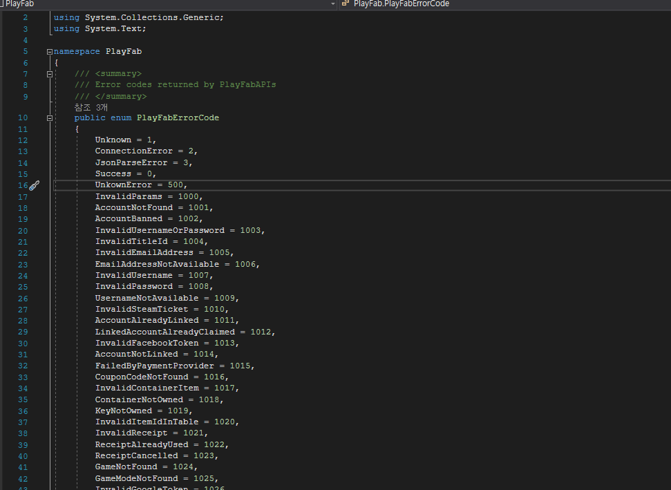 이 PlayFabErrorCode를 타고 들어가보면 Enum(열거형) 타입으로 만들어져있는 것을 알 수 있다.