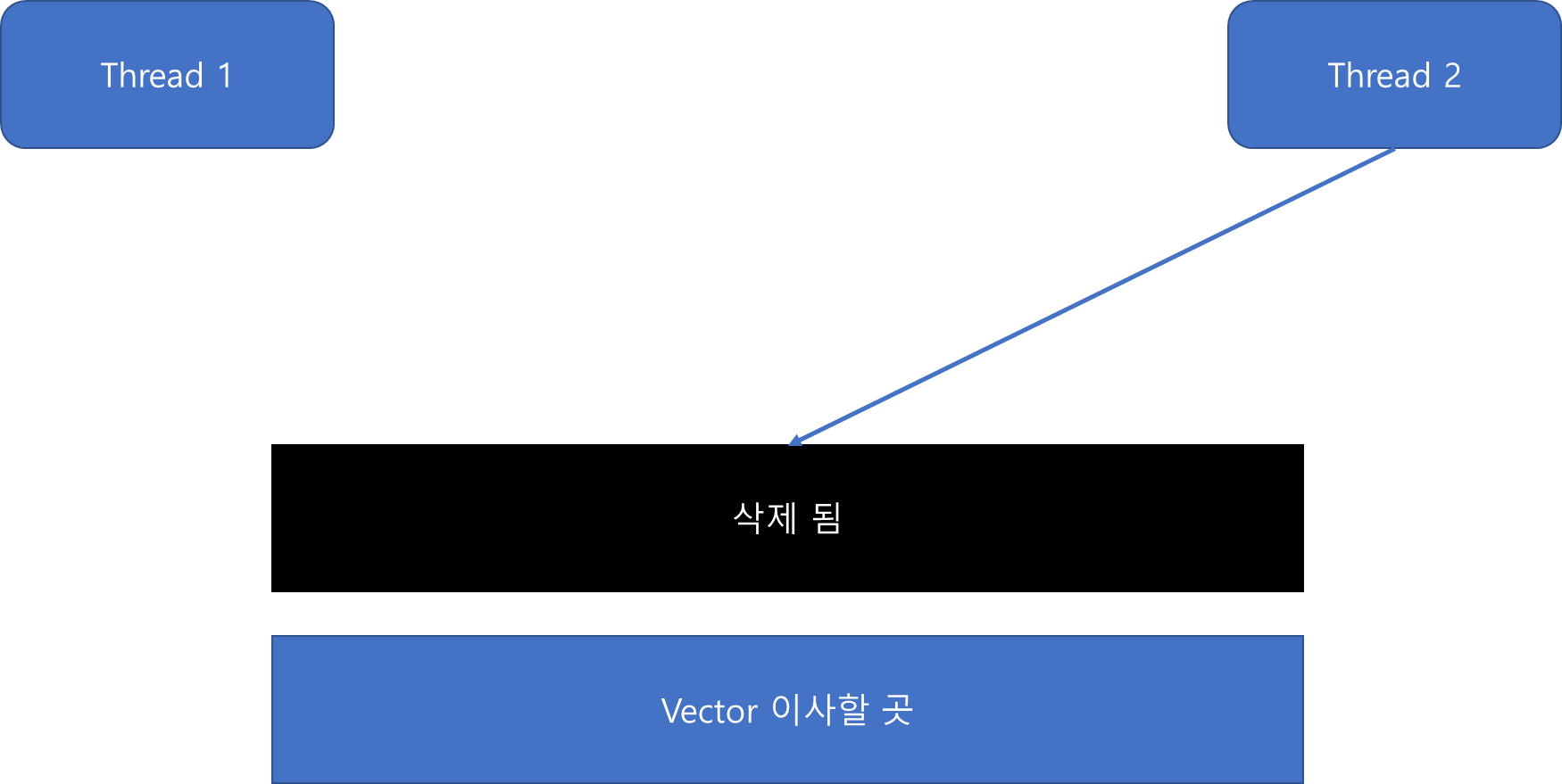 먼저 1번 쓰레드가 Vector에 접근하여 capacity가 부족해서 이사할 곳으로 이사 후 기존 vector의 메모리를 삭제하게 된다.
